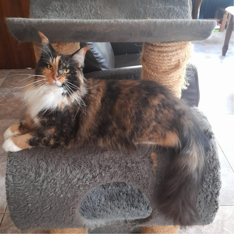 Malia is een Black Tortie White Maine coon poesje. Ze is net als Milano geboren op 15-03-2018.